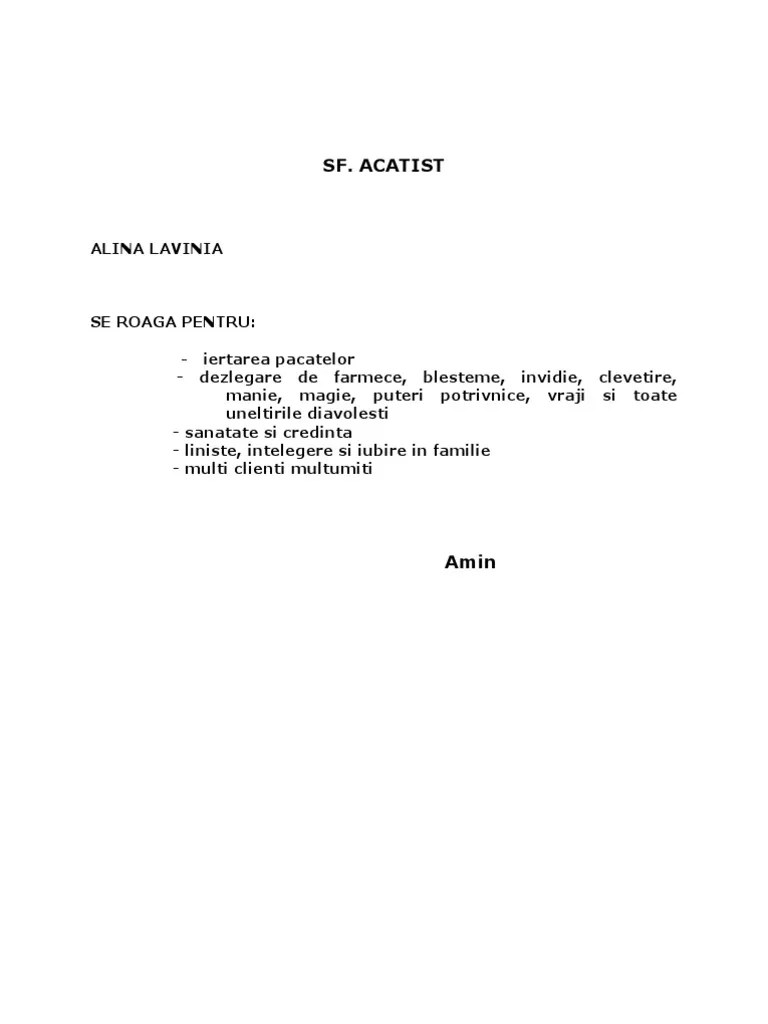 Iată ce trebuie să conțină acatistul tău pentru a fi iertat... Acatistul sfantului mare mucenic mina(11 noiembrie)sa va fie de folos! Imparate ceresc, mangaietorule, duhul adevarului, care pretutindenea esti si toate le implinesti, vistierul bunatatilor si datatorule de. Iată ce trebuie să conțină acatistul tău pentru a fi iertat... Acatistul către dumnezeu tatăl pentru cei adormiţi {play}audio/acatiste/acatist catre dumnezeu tatal pentru cei adormiti.mp3{/play}